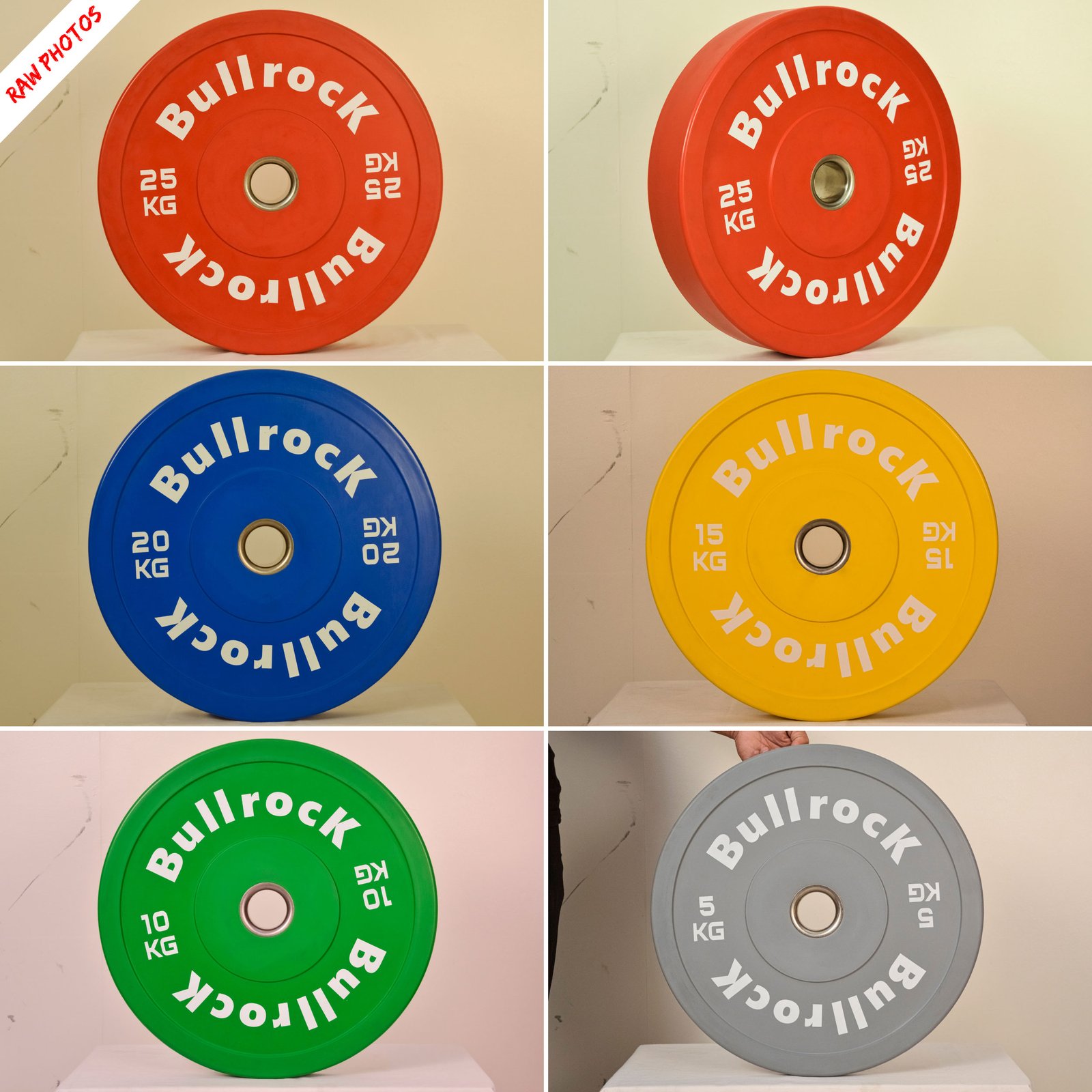 Colored bumper plate set in stock. From size 5 KG to 25 KG Diameter. Minimal Bounce making these safe when exercising. Thinner design than other style bumper plates that allow you to fit more weight on the bar.